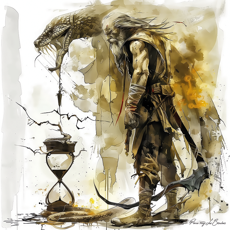 Cette œuvre est au format 100 x 100 cm en un seul exemplaire. La signature de l’œuvre et du certificat d’authenticité l’accompagnant obligatoirement en font foi. Il est convenu dans tous les cas de figure que l’artiste demeure entièrement et inconditionnellement le titulaire de tous ses droits d’auteur. Chronos, souvent confondu avec le titan Cronos, est une figure complexe et fascinante de la mythologie grecque. Tandis que Cronos, fils d’Ouranos (le Ciel) et de Gaïa (la Terre), est célèbre pour avoir régné sur les Titans et dévoré ses enfants pour éviter d’être détrôné, Chronos incarne le Temps lui-même, une force omniprésente et inéluctable.