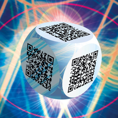 Prévisualisation du dé avec 6 logogrammes de citations sur art contemporain. Le fond de type artistico-technoïde est une suggestion de présentation.